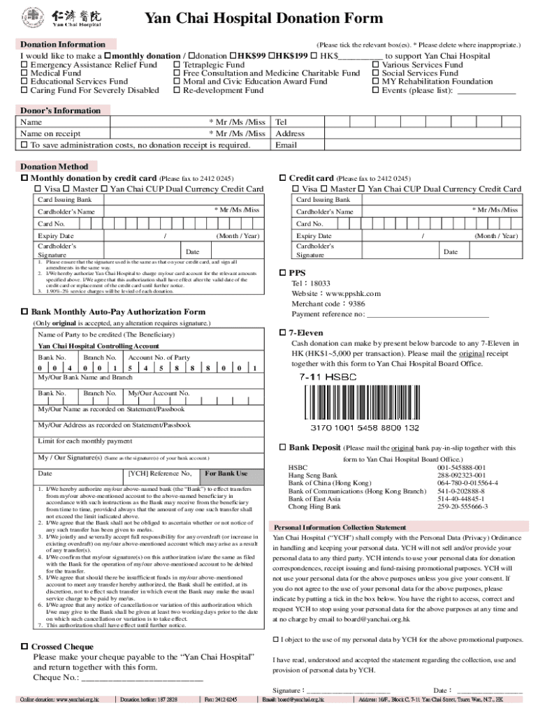 Yan Chai Hospital Donation Form Donation Information (Please tick the relevant box(es). * Please delete where inappropriate.) I would like to make a monthly donation / donation HK$99 HK$199 HK$___