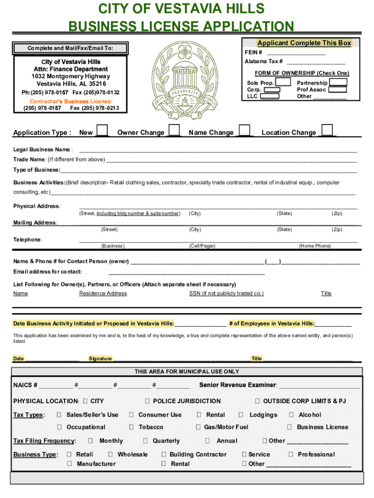 CITY OF VESTAVIA HILLS BUSINESS LICENSE APPLICATION Applicant Complete This BoxComplete and Mail/Fax/Email To:FEIN # ___CAlabama Tax # ___ FORM OF OWNERSHIP (Check One)1032 Montgomery Highway Vestavia
