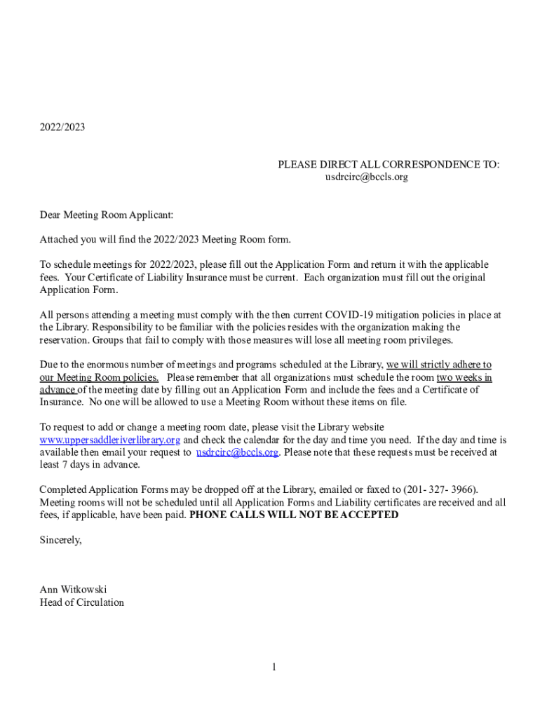 2022/2023 PLEASE DIRECT ALL CORRESPONDENCE TO: usdrcirc@bccls.org Dear Meeting Room Applicant: Attached you will find the 2022/2023 Meeting Room form. To schedule meetings for 2022/2023, please fill