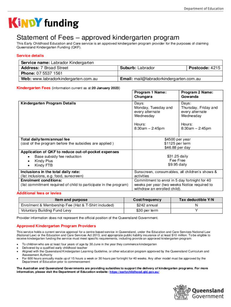 Statement of Fees approved kindergarten program This Early Childhood Education and Care service is an approved kindergarten program provider for the purposes of claiming Queensland Kindergarten Funding