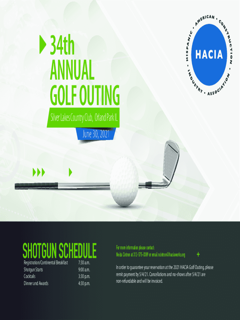 34th ANNUAL GOLF OUTING Silver Lakes Country Club, Orland Park IL June 30, 2021SHOTGUN SCHEDULE Registration/Continental Breakfast Shotgun Starts Cocktails Dinner and Awards7:30 a.m. 9:00 a.m. 3:30