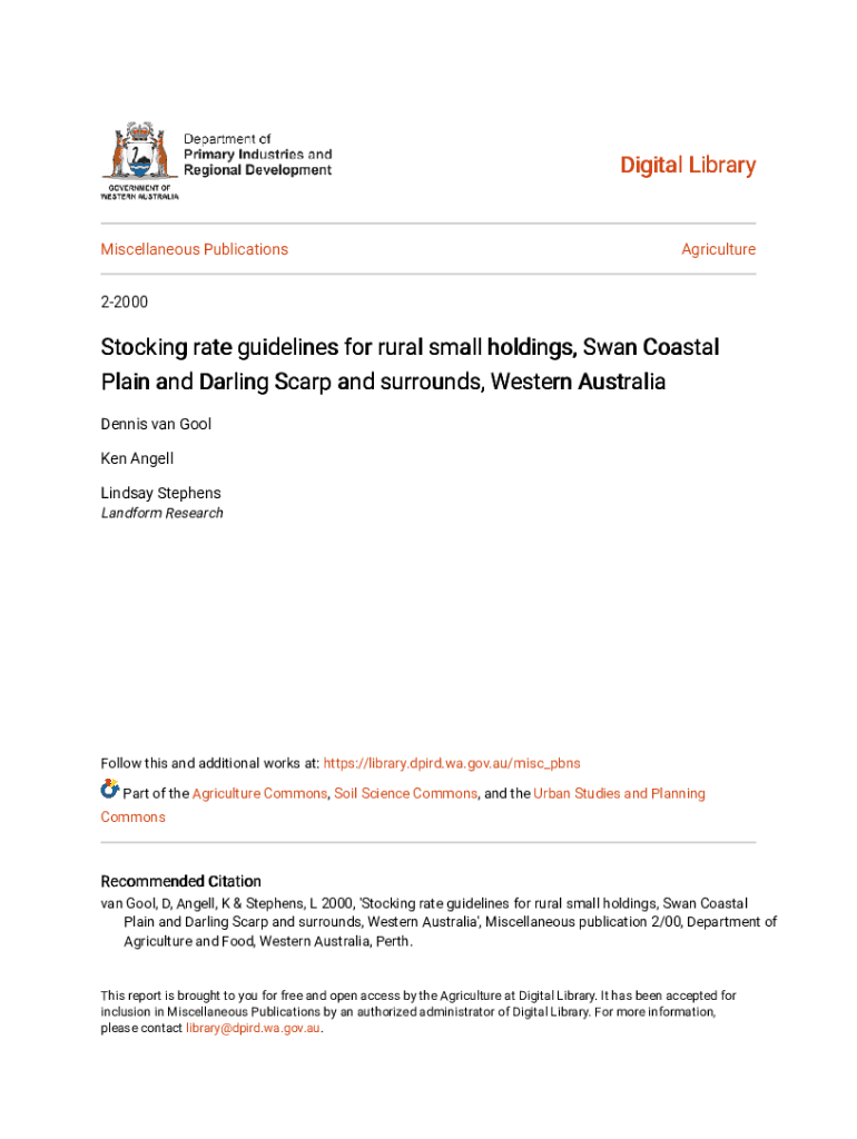 Digital LibraryMiscellaneous PublicationsAgriculture22000Stocking rate guidelines for rural small holdings, Swan Coastal Plain and Darling Scarp and surrounds, Western Australia Dennis van Gool Ken