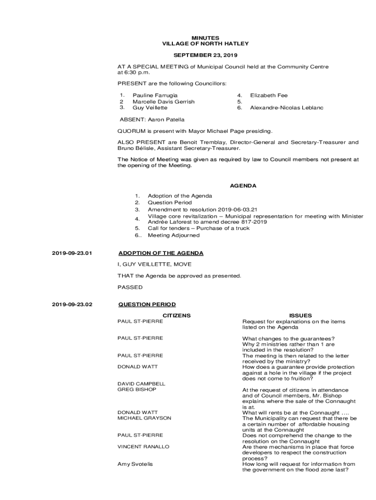 MINUTES VILLAGE OF NORTH HATLEY SEPTEMBER 23, 2019 AT A SPECIAL MEETING of Municipal Council held at the Community Centre at 6:30 p.m. PRESENT are the following Councillors: 1. 2 3.Pauline Farrugia