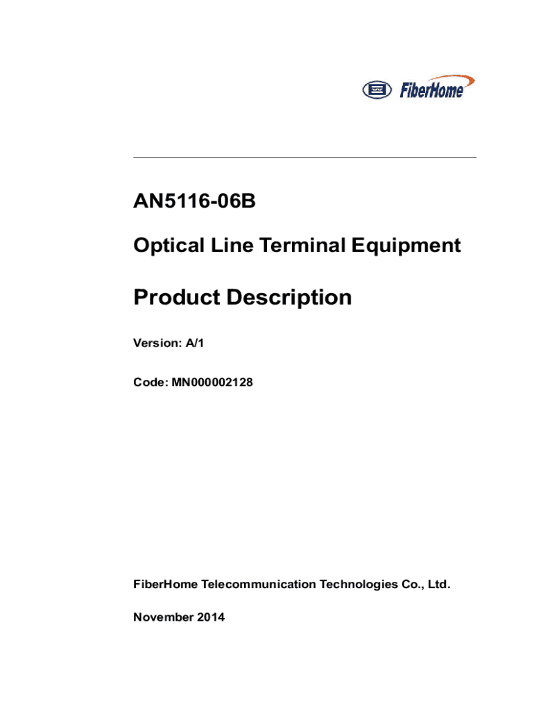 AN511606B Optical Line Terminal EquipmentProduct Description Version: A/1 Code: MN000002128FiberHome Telecommunication Technologies Co., Ltd. November 2014Thank you for choosing our products.We appreciate