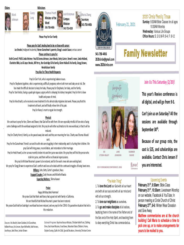 EldersMinisters Mark JohnsonCasey LongThomas Pruett Minister of the Word 5417584456Josh Stutzman Campus MinisterMaria Zhang Secretary 54175844562020 Circle Family Times February 21, 20215417534310Please