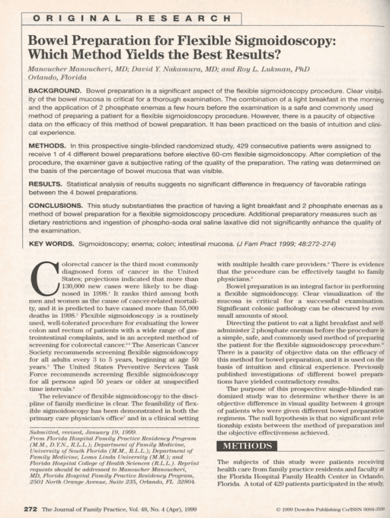 O R I G I N A LR E S E A R C HBowel Preparation for Flexible Sigmoidoscopy: Which Method Yields the Best Results? Manoucher Manoucheri., MD; David Y. Nakamura, MD; and Roy L. Lukman, PhD Orlando,