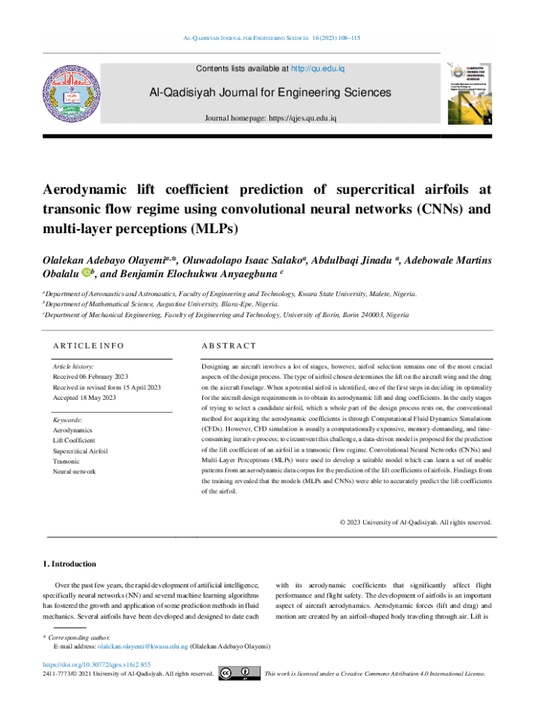 ALQADISIYAH JOURNAL FOR ENGINEERING SCIENCES 16 (2023) 108115Contents lists available at http://qu.edu.iqAlQadisiyah Journal for Engineering Sciences Journal homepage: https://qjes.qu.edu.iqAerodynamic