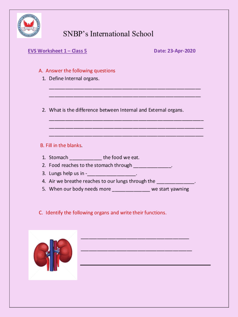 SNBPs International School EVS Worksheet 1 Class 5Date: 23Apr2020A. Answer the following questions 1. Define Internal organs. ___ ___ 2. What is the difference between Internal and External organs.
