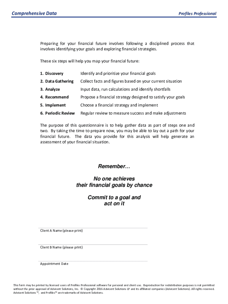 Comprehensive DataProfiles ProfessionalPreparing for your financial future involves following a disciplined process that involves identifying your goals and exploring financial strategies. These six