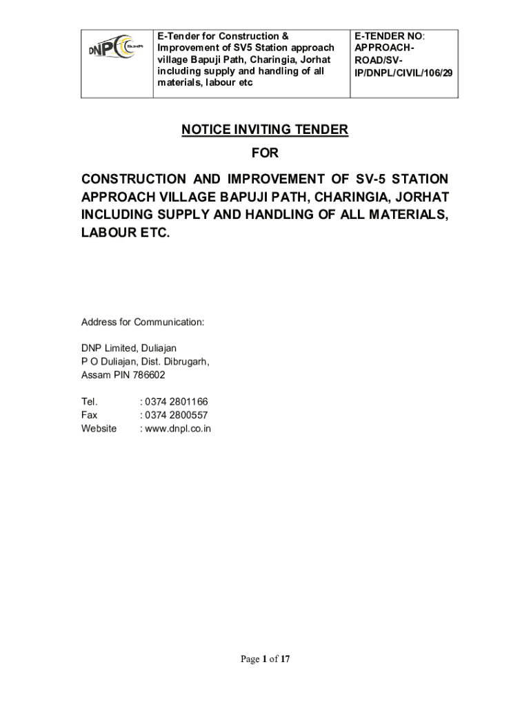 ETender for Construction & Improvement of SV5 Station approach village Bapuji Path, Charingia, Jorhat including supply and handling of all materials, labour etcETENDER NO: APPROACHROAD/SVIP/DNPL/CIVIL/106/29NOTICE