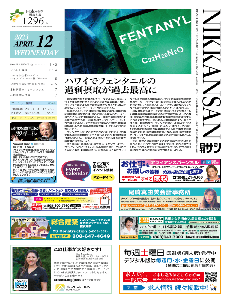 1296STATE OF HAWAII VISITOR INFORMATION PROGRAM202312APRIL WEDNESDAY HAWAII NEWS .................1 3 ......................24 ....... 5 JAPAN NEWS / WORLD NEWS...... 45 ........... 7 eJOB .........................