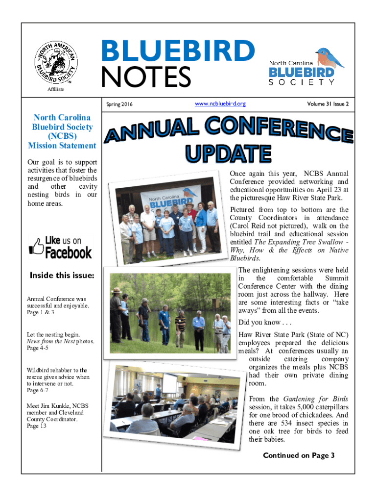 AffiliateBLUEBIRD NOTES Spring 2016www.ncbluebird.orgNorth Carolina Bluebird Society (NCBS) Mission Statement Our goal is to support activities that foster the resurgence of bluebirds and other cavity