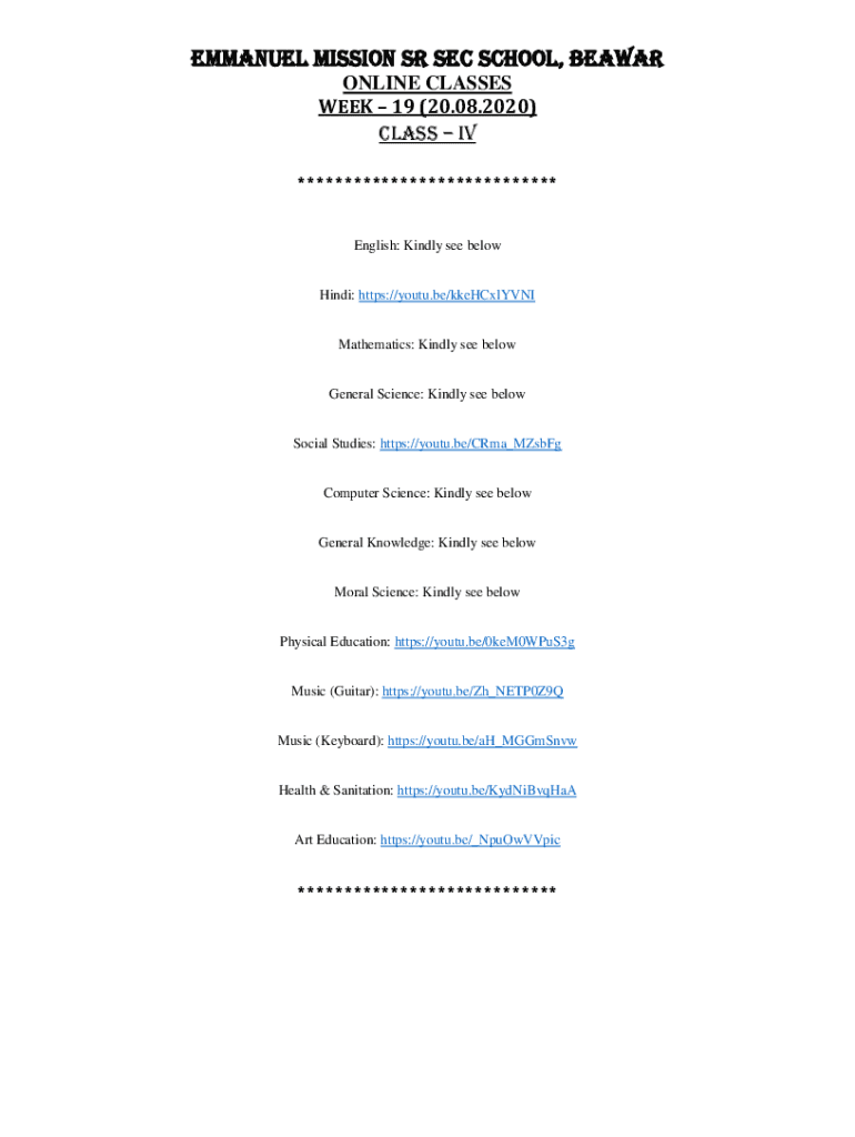 EMMANUEL MISSION SR SEC SCHOOL, BEAWAR ONLINE CLASSES WEEK 19 (20.08.2020) CLASS IV ****************************English: Kindly see belowHindi: https://youtu.be/kkeHCxlYVNIMathematics: Kindly see
