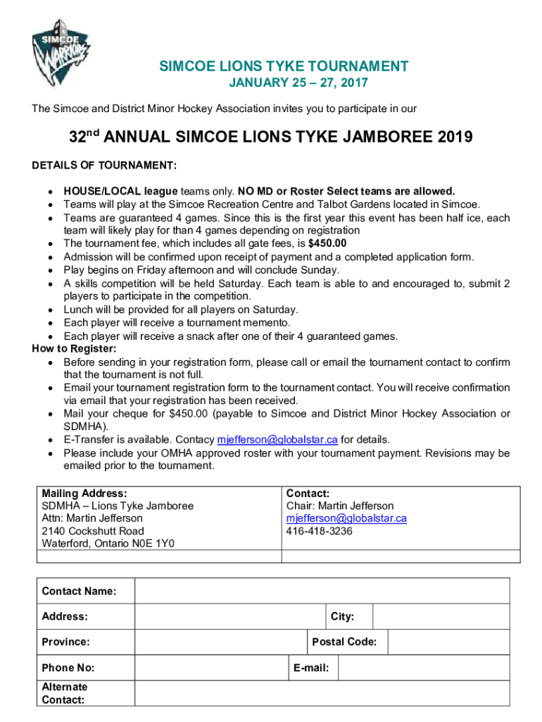 [SIMCOE LIONS TYKE TOURNAMENT JANUARY 25 27, 2017 The Simcoe and District Minor Hockey Association invites you to participate in our32nd ANNUAL SIMCOE LIONS TYKE JAMBOREE 2019 DETAILS OF TOURNAMENT: