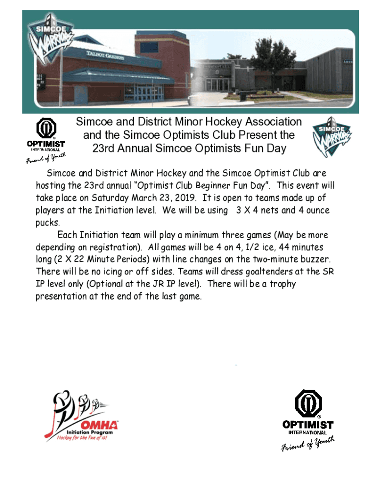 Simcoe and District Minor Hockey Association and the Simcoe Optimists Club Present the 23rd Annual Simcoe Optimists Fun Day Simcoe and District Minor Hockey and the Simcoe Optimist Club are hosting