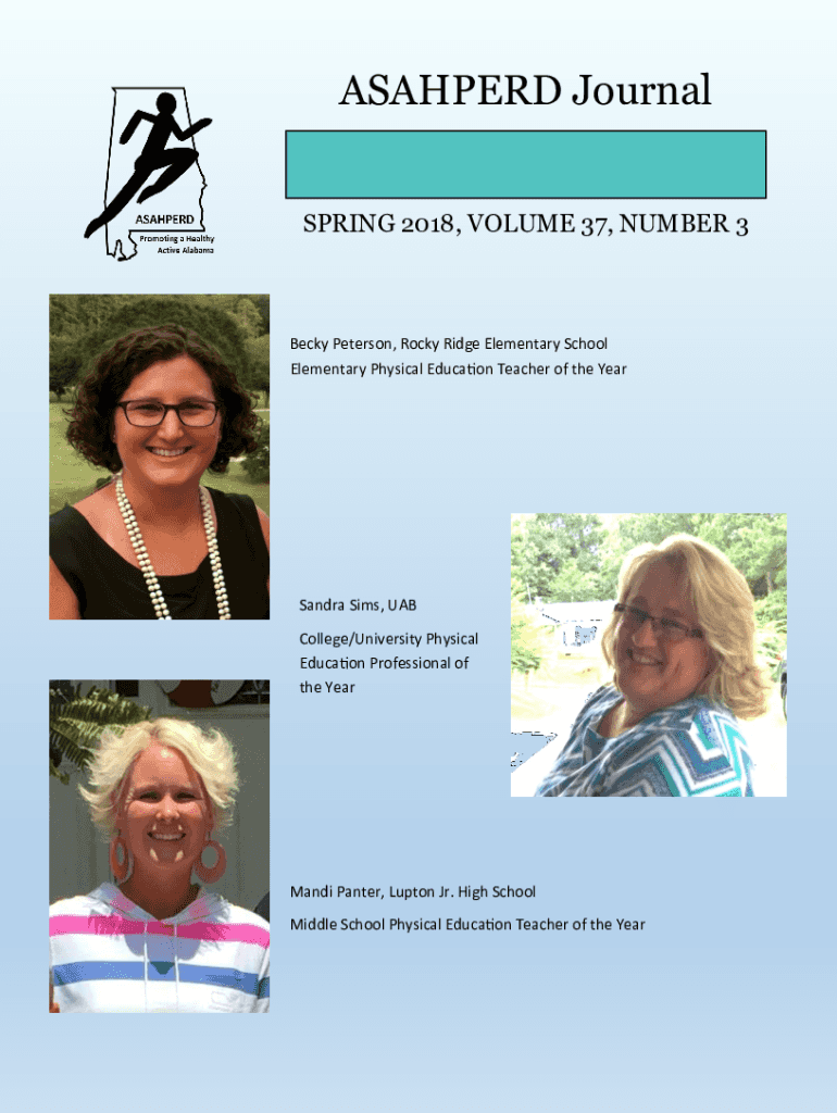 ASAHPERD Journal SPRING 2018, VOLUME 37, NUMBER 3Becky Peterson, Rocky Ridge Elementary School Elementary Physical Education Teacher of the YearSandra Sims, UAB College/University Physical Education