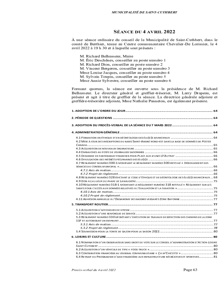 MUNICIPALIT DE SAINTCUTHBERTSANCE DU 4 AVRIL 2022 une sance ordinaire du conseil de la Municipalit de SaintCuthbert, dans le comt de Berthier, tenue au Centre communautaire ChevalierDe Lorimier, le