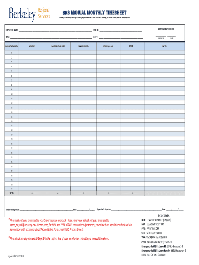 BRS MANUAL MONTHLY TIMESHEET University of California, Berkeley Berkeley Regional Services 1608 4th Street Berkeley, CA 94710 Phone: (510) 664 9000, Option 3EMPLOYEE NAME: ___ TITLE: ___DAYOFTHEMONTHUCB