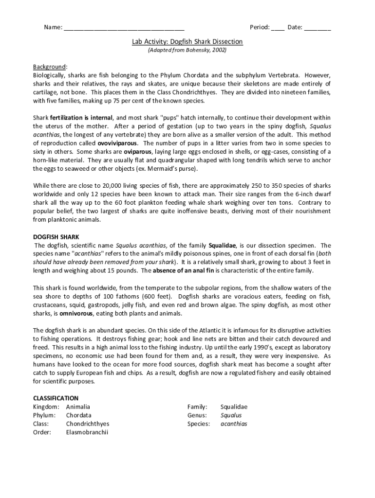 Name: ___Period: ___ Date: ___Lab Activity: Dogfish Shark Dissection (Adapted from Bohensky, 2002)Background: Biologically, sharks are fish belonging to the Phylum Chordata and the subphylum Vertebrata.