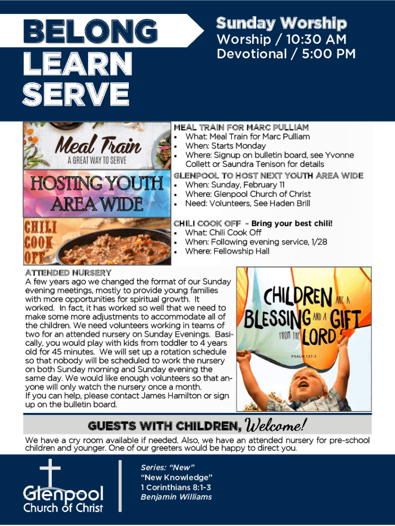 Sunday WorshipBELONG LEARN SERVE HOSTING YOUTH AREA WIDEWorship / 10:30 AM Devotional / 5:00 PMMEAL TRAIN FOR MARC PULLIAM What: Meal Train for Marc Pulliam When: Starts Monday Where: Signup on bulletin