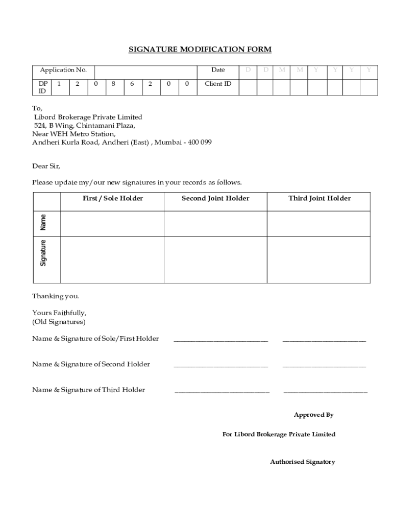 SIGNATURE MODIFICATION FORM Application No. DP ID12Date 086200DDMMYYYYClient IDTo, Libord Brokerage Private Limited 524, B Wing, Chintamani Plaza, Near WEH Metro Station, Andheri Kurla Road, Andheri