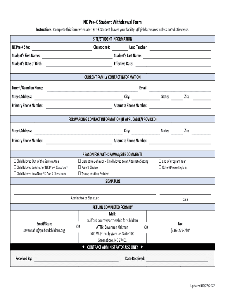 NC PreK Student Withdrawal FormInstructions: Complete this form when a NC PreK Student leaves your facility. All fields required unless noted otherwise. SITE/STUDENT INFORMATION NC PreK Site:Classroom