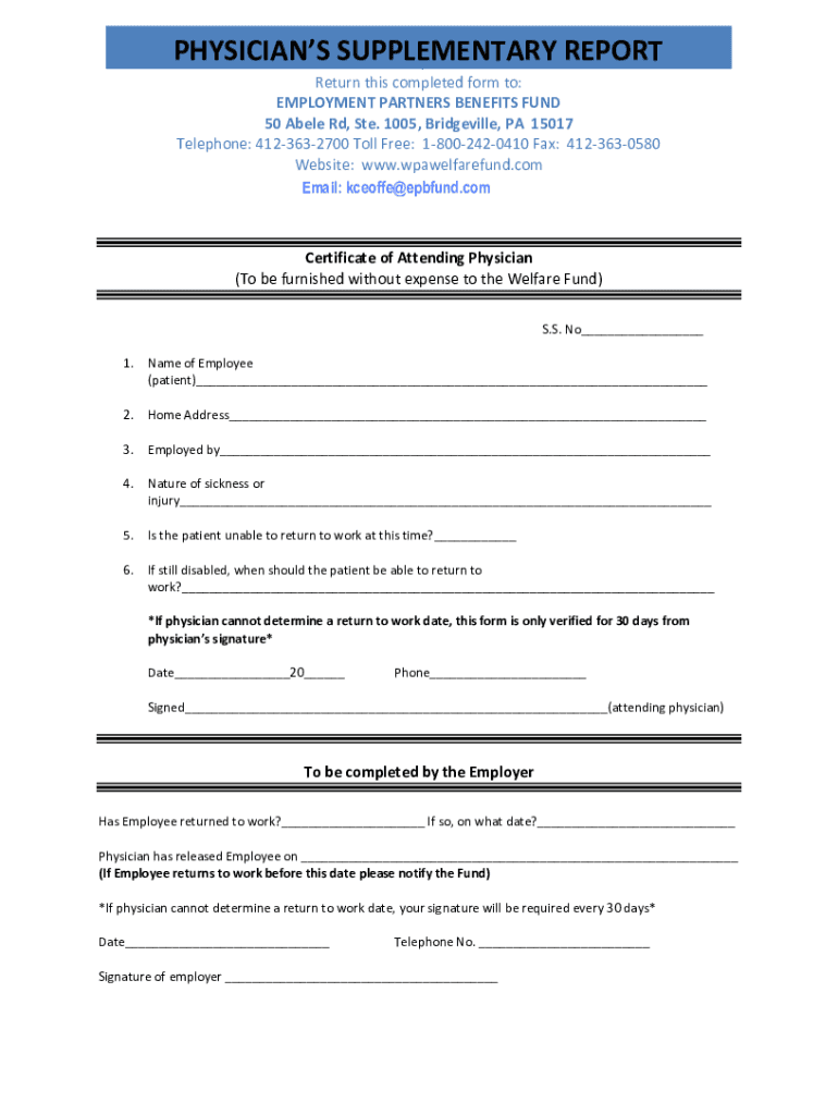 PHYSICIANSReturn SUPPLEMENTARY REPORT this completed form to: Return this completed form to: EMPLOYMENT PARTNERS BENEFITS FUND 50 Abele Rd, Ste. 1005, Bridgeville, PA 15017 Telephone: 4123632700 Toll