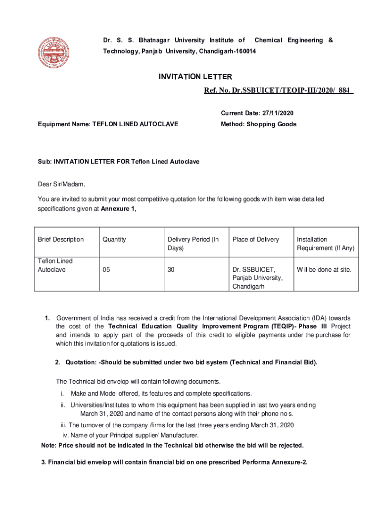 Dr. S. S. Bhatnagar University Institute ofChemical Engineering &Technology, Panjab University, Chandigarh160014INVITATION LETTER Ref. No. Dr.SSBUICET/TEQIPIII/2020/_884_ Current Date: 27/11/2020