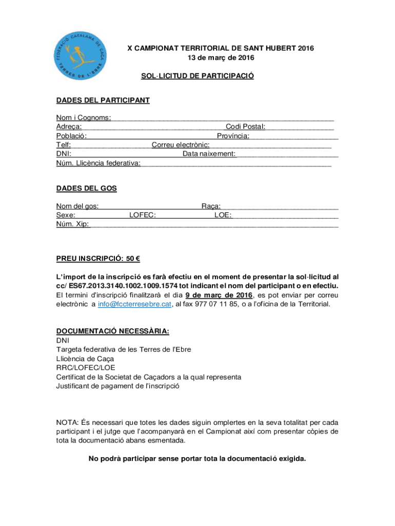 X CAMPIONAT TERRITORIAL DE SANT HUBERT 2016 13 de mar de 2016 SOLLICITUD DE PARTICIPACIDADES DEL PARTICIPANT Nom i Cognoms:___ Adrea:___ Codi Postal:___ Poblaci: Provncia:___ Telf:___Correu electrnic:___