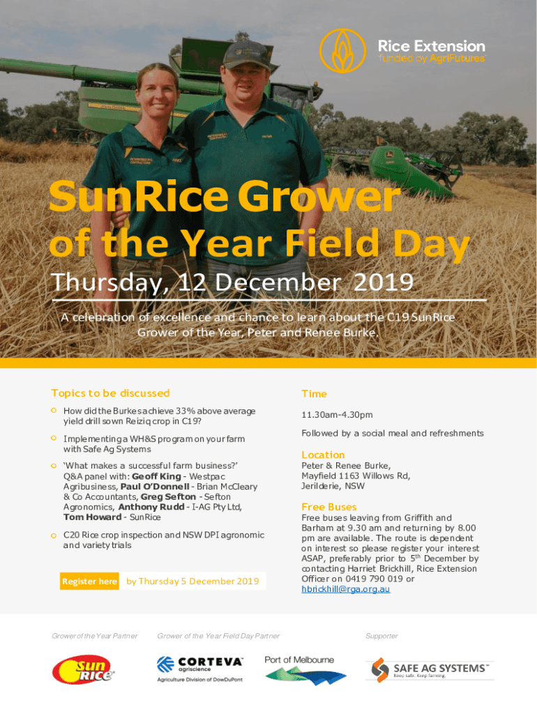 SunRice Grower of the Year Field Day Thursday, 12 December 2019 A celebration of excellence and chance to learn about the C19 SunRice Grower of the Year, Peter and Renee Burke.Topics to be discussed