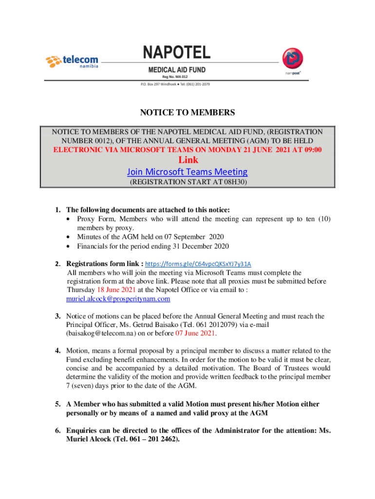 NOTICE TO MEMBERS NOTICE TO MEMBERS OF THE NAPOTEL MEDICAL AID FUND, (REGISTRATION NUMBER 0012), OF THE ANNUAL GENERAL MEETING (AGM) TO BE HELD ELECTRONIC VIA MICROSOFT TEAMS ON MONDAY 21 JUNE 2021