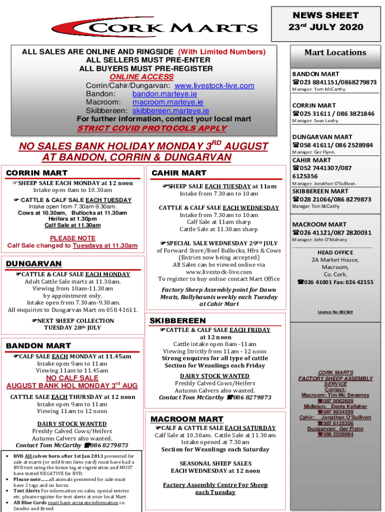 NEWS SHEET 23rd JULY 2020 ALL SALES ARE ONLINE AND RINGSIDE (With Limited Numbers) ALL SELLERS MUST PREENTER ALL BUYERS MUST PREREGISTER ONLINE ACCESS Corrin/Cahir/Dungarvan: www.livestocklive.com