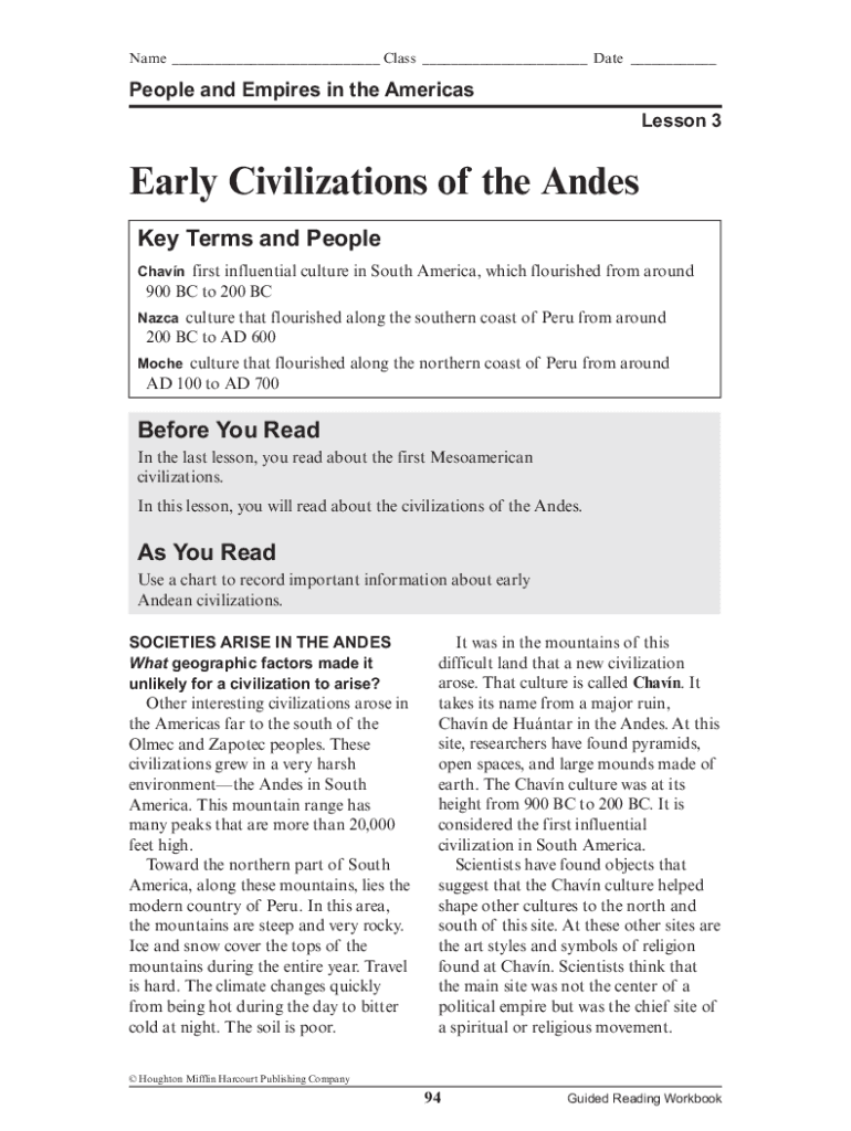 Name ___ Class ___ Date ___People and Empires in the AmericasLesson 3Early Civilizations of the Andes Key Terms and People Chavn first influential culture in South America, which flourished from around900