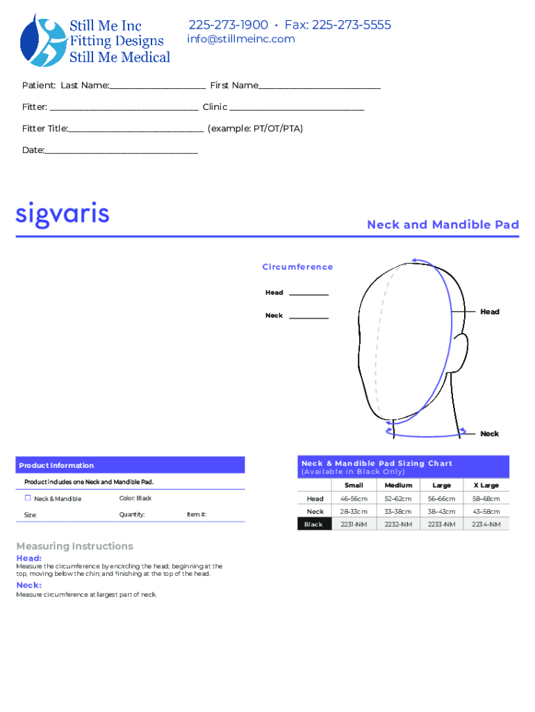 2252731900 Fax: 2252735555info@stillmeinc.comPatient: Last Name:___ First Name___ Fitter: ___ Clinic ___ Fitter Title:___ (example: PT/OT/PTA) Date:___Neck and Mandible PadC ircu m fe re n ce HeadHeadNeckNeckNeck
