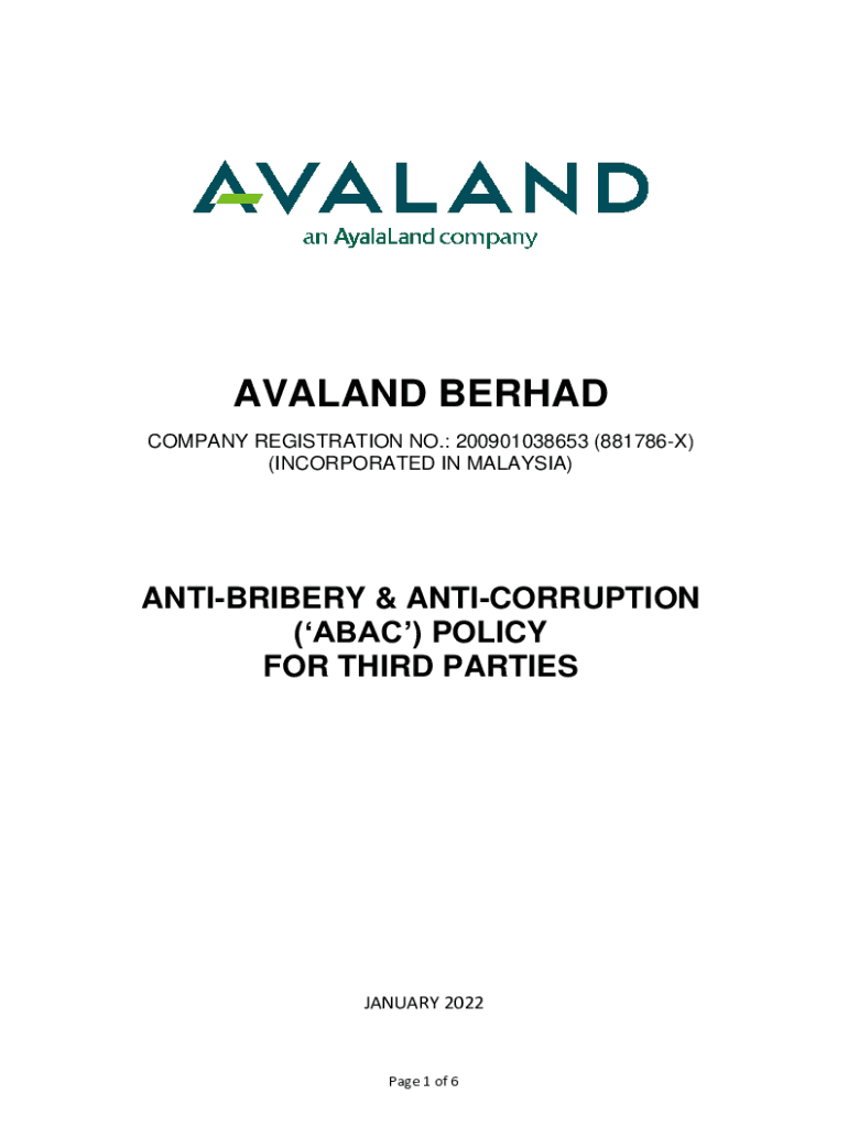 AVALAND BERHAD COMPANY REGISTRATION NO.: 200901038653 (881786X) (INCORPORATED IN MALAYSIA)ANTIBRIBERY & ANTICORRUPTION (ABAC) POLICY FOR THIRD PARTIESJANUARY 2022Page 1 of 6TABLE OF CONTENTS1.INTRODUCTION2.SCOPE3.DEFINITION4.RESPONSIBILITIES5.REFERENCES6.POLICY7.FACILITATION