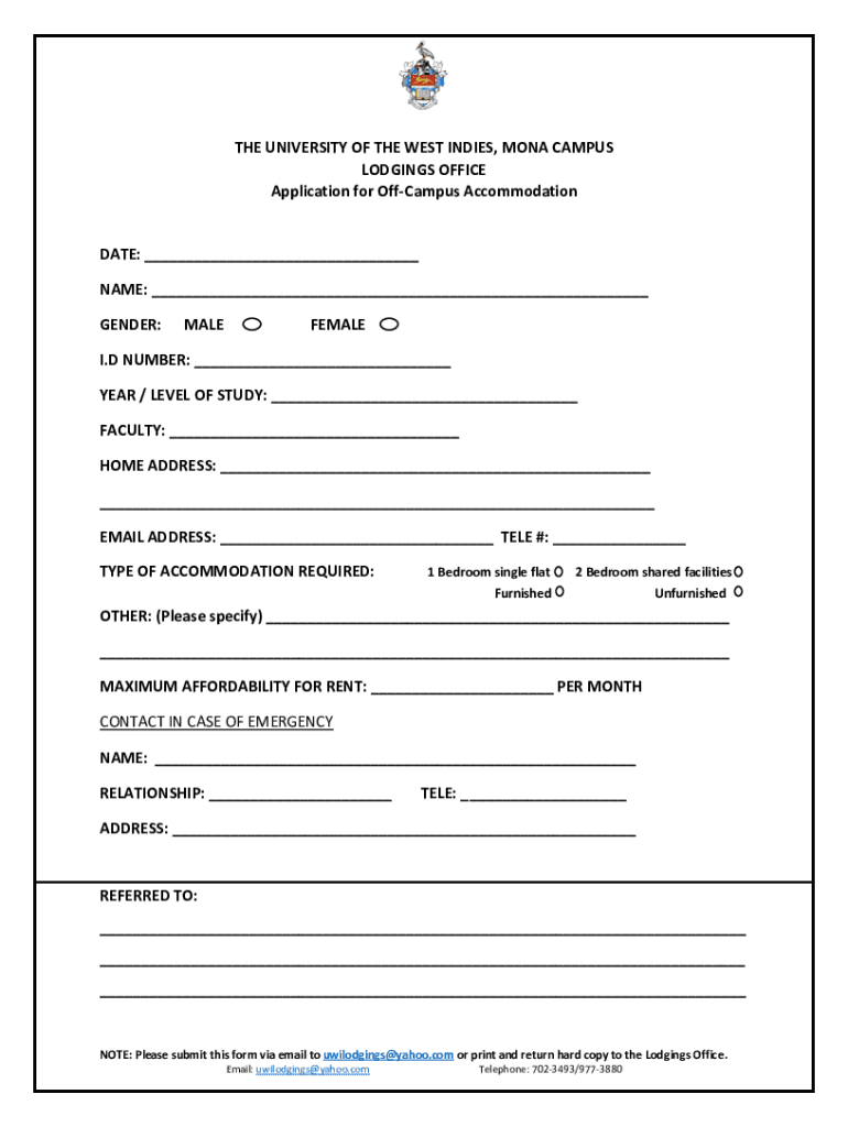 THE UNIVERSITY OF THE WEST INDIES, MONA CAMPUS LODGINGS OFFICE Application for OffCampus Accommodation DATE: ___ NAME: ___ GENDER:MALEFEMALEI.D NUMBER: ___ YEAR / LEVEL OF STUDY: ___ FACULTY: ___
