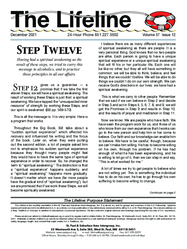 December 202124Hour Phone 651.227.5502Step TwelveHaving had a spiritual awakening as the result of these steps, we tried to carry this message to alcoholics, and to practice these principles in all