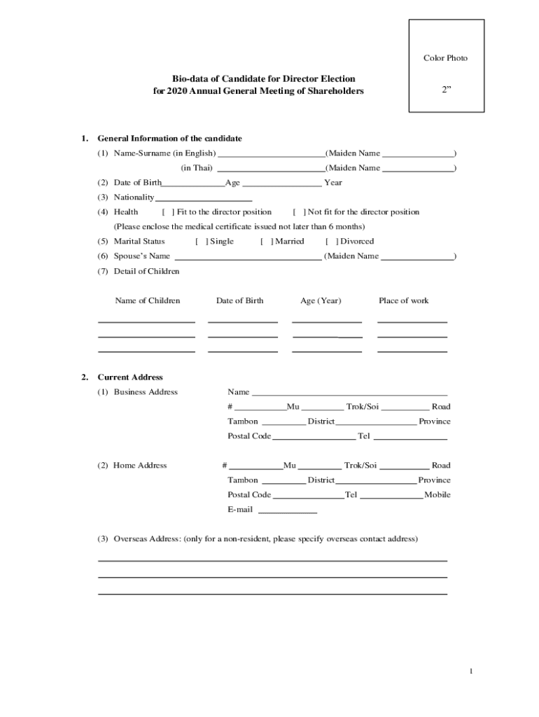 Color PhotoBiodata of Candidate for Director Election for 2020 Annual General Meeting of Shareholders1.2General Information of the candidate (1) NameSurname (in English) (in Thai) (2) Date of BirthAge(Maiden