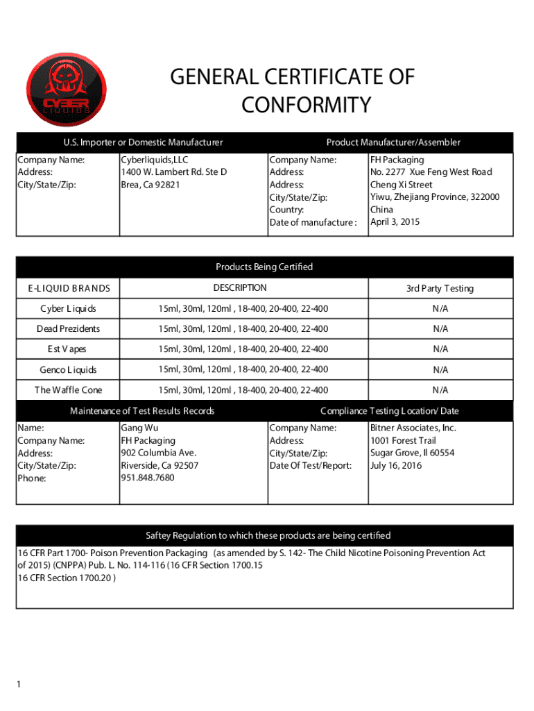 GENERAL CERTIFICATE OF CONFORMITY U.S. Importer or Domestic Manufacturer Company Name: Address: City/State/Zip:Cyberliquids,LLC 1400 W. Lambert Rd. Ste D Brea, Ca 92821Product Manufacturer/Assembler