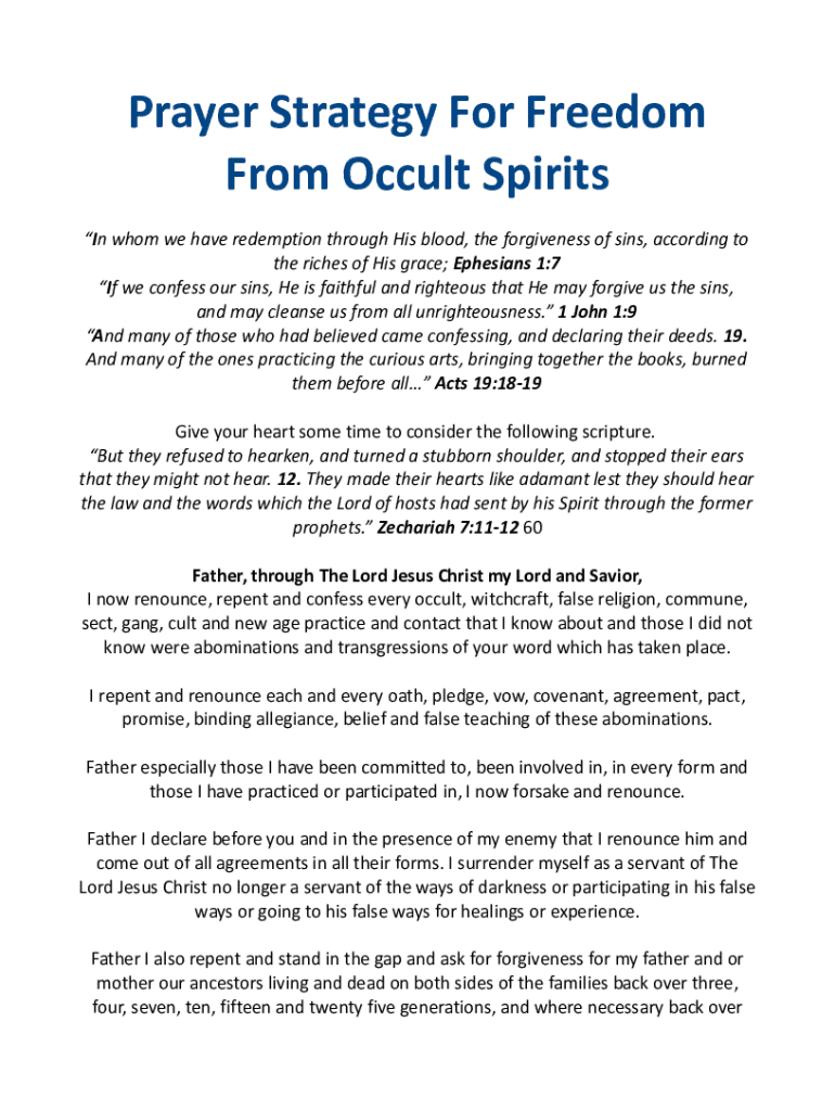 Prayer Strategy For Freedom From Occult Spirits In whom we have redemption through His blood, the forgiveness of sins, according to the riches of His grace; Ephesians 1:7 If we confess our sins, He