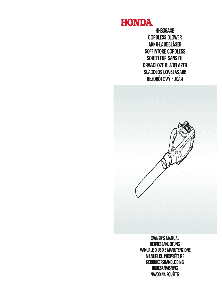 HHB36AXB CORDLESS BLOWER AKKULAUBBLSER SOFFIATORE CORDLESS SOUFFLEUR SANS FIL DRAADLOZE BLADBLAZER SLADDLS LVBLSARE BEZDRTOV FUKR Honda Motor Europe, Ltd 2019 3RY0C600 00X3RY0C6000EN DE IT FR NL SV