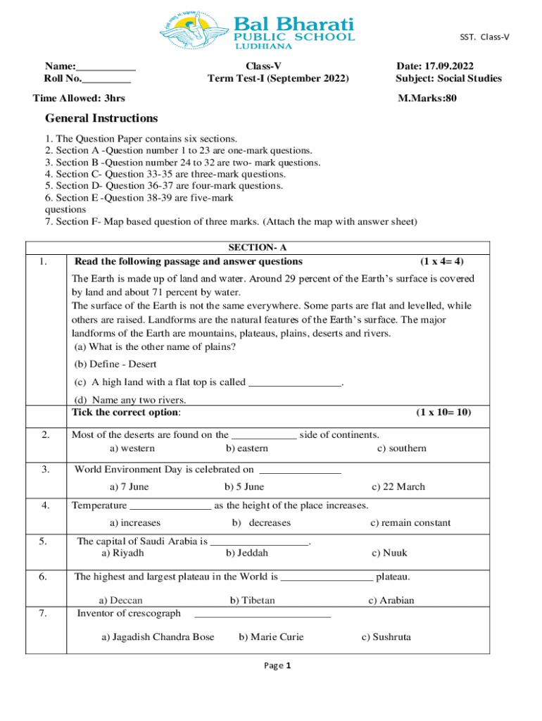 SST. ClassVName:___ Roll No.___ClassV Term TestI (September 2022)Date: 17.09.2022 Subject: Social StudiesTime Allowed: 3hrsM.Marks:80General Instructions 1. The Question Paper contains six sections.