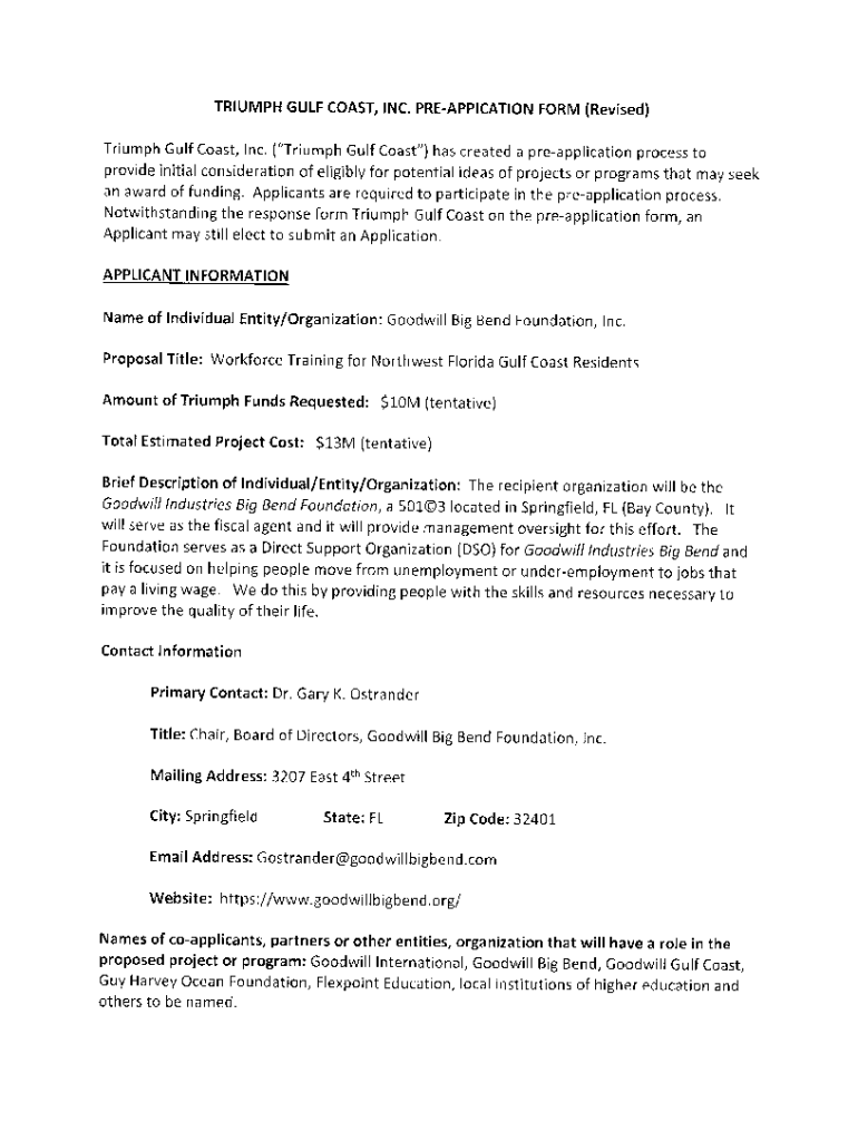 TRIUMPH GULF COAST, INC. pREApptCATtON FORM (Revised)Triumph Gulf Coast, lnc. (\"Triumph Gulf Coast\") has created a preapplication process to provide initial consideration of eligibly for potential