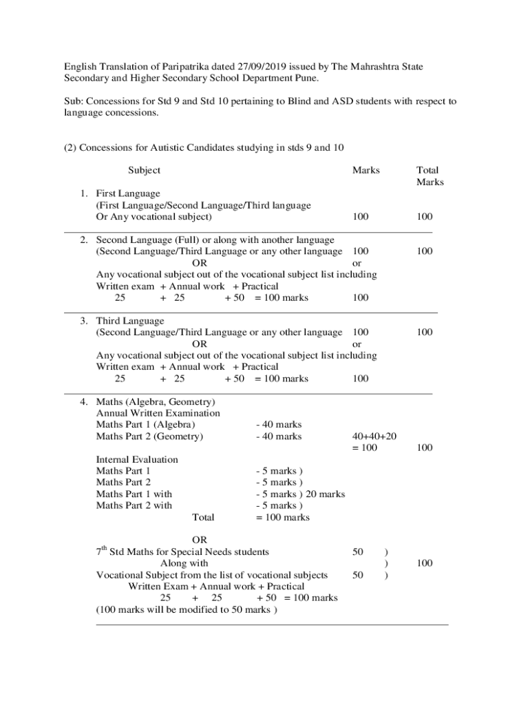 English Translation of Paripatrika dated 27/09/2019 issued by The Mahrashtra State Secondary and Higher Secondary School Department Pune. Sub: Concessions for Std 9 and Std 10 pertaining to Blind
