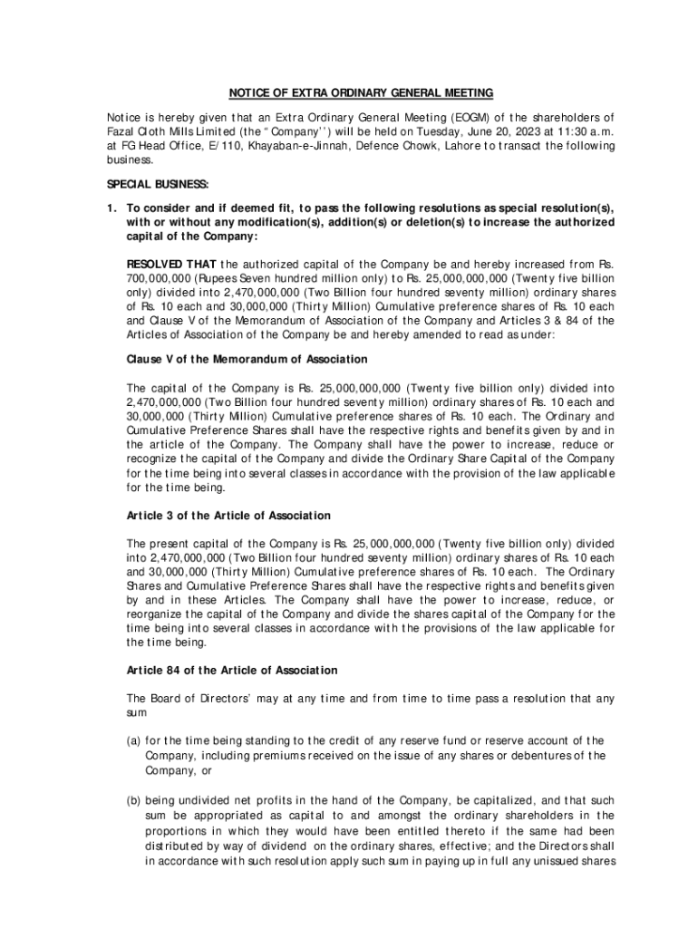 NOTICE OF EXTRA ORDINARY GENERAL MEETING Notice is hereby given that an Extra Ordinary General Meeting (EOGM) of the shareholders of Fazal Cloth Mills Limited (the Company) will be held on Tuesday,