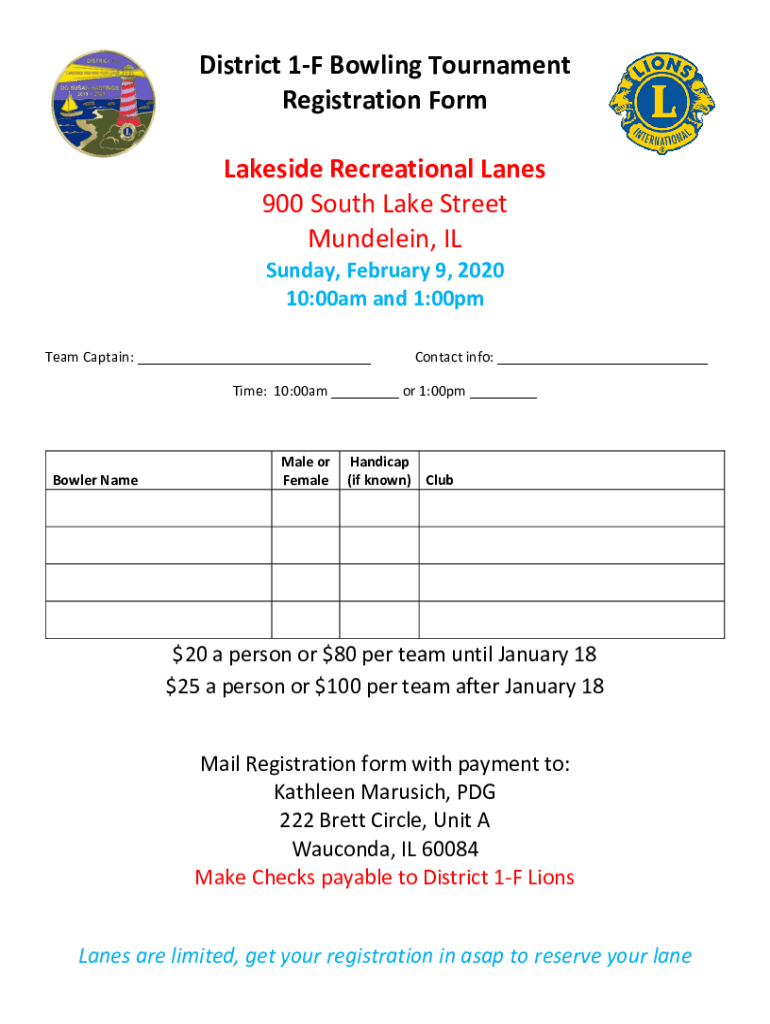 District 1F Bowling Tournament Registration Form Lakeside Recreational Lanes 900 South Lake Street Mundelein, IL Sunday, February 9, 2020 10:00am and 1:00pm Team Captain: ___Contact info: ___Time: