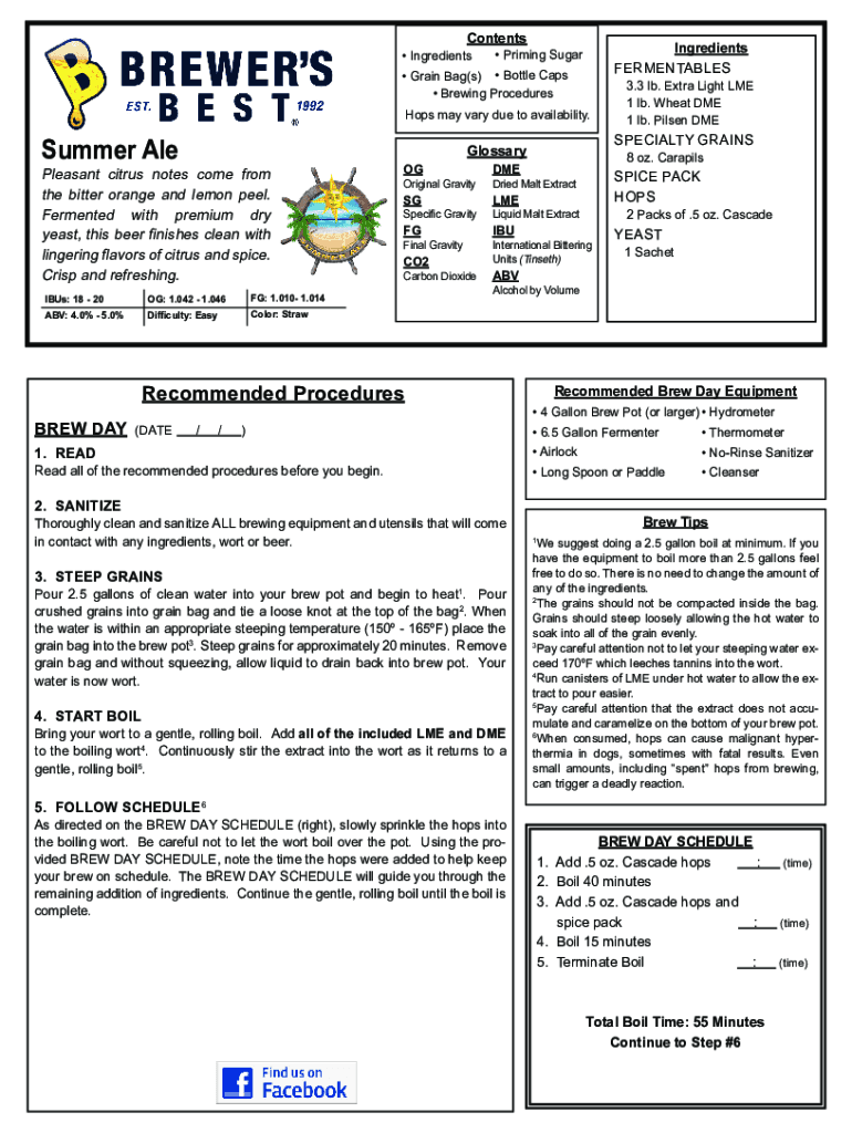 To fill out Brewers Best 5 Gallon, you typically need to follow guidelines provided in your homebrewing kit, ensuring you include all relevant brewing data such as ingredients used, dates, and fermentation details.