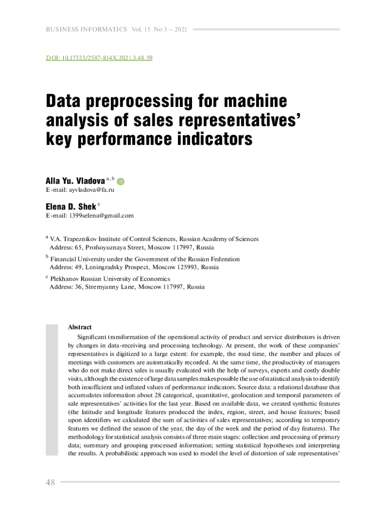 BUSINESS INFORMATICS Vol. 15 No 3 2021DOI: 10.17323/2587814X.2021.3.48.59Data preprocessing for machine analysis of sales representatives key performance indicators Alla Yu. Vladova a, bEmail: ayvladova@fa.ruElena
