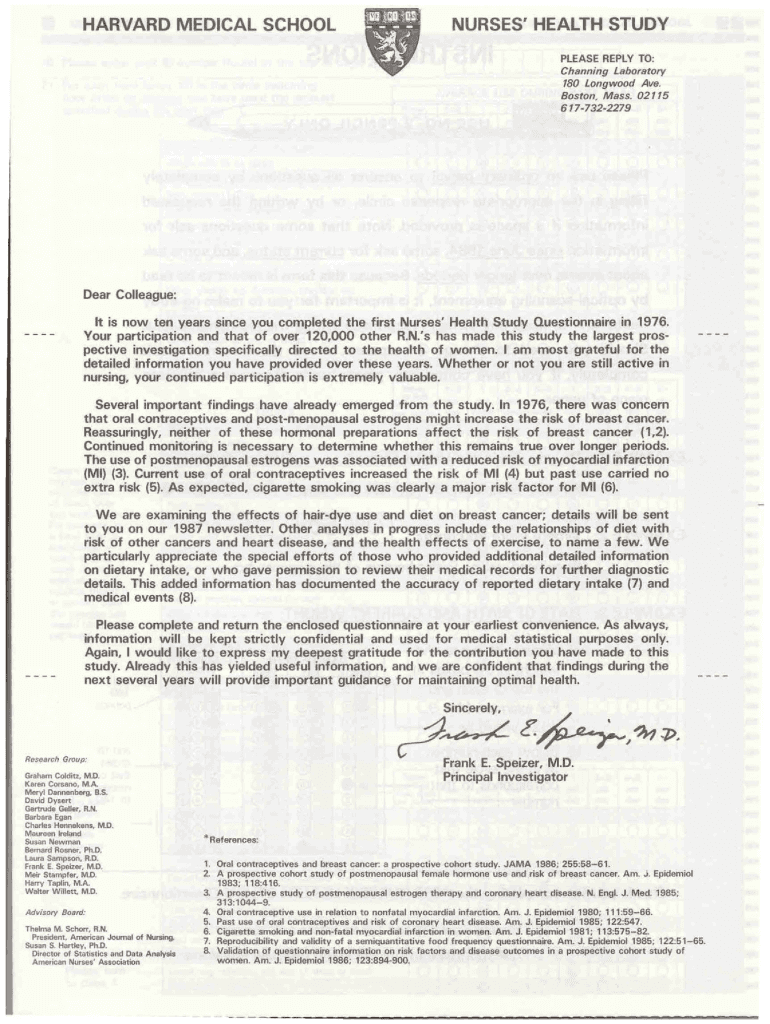 NURSES\' HEALTH STUDYHARVARD MEDICAL SCHOOLPLEASE REPLY TO: Channing Laboratory 180 Longwood Ave. Boston. Mass. 02115 6177322279Dear Colleague:It is now ten years since you completed the first Nurses\'