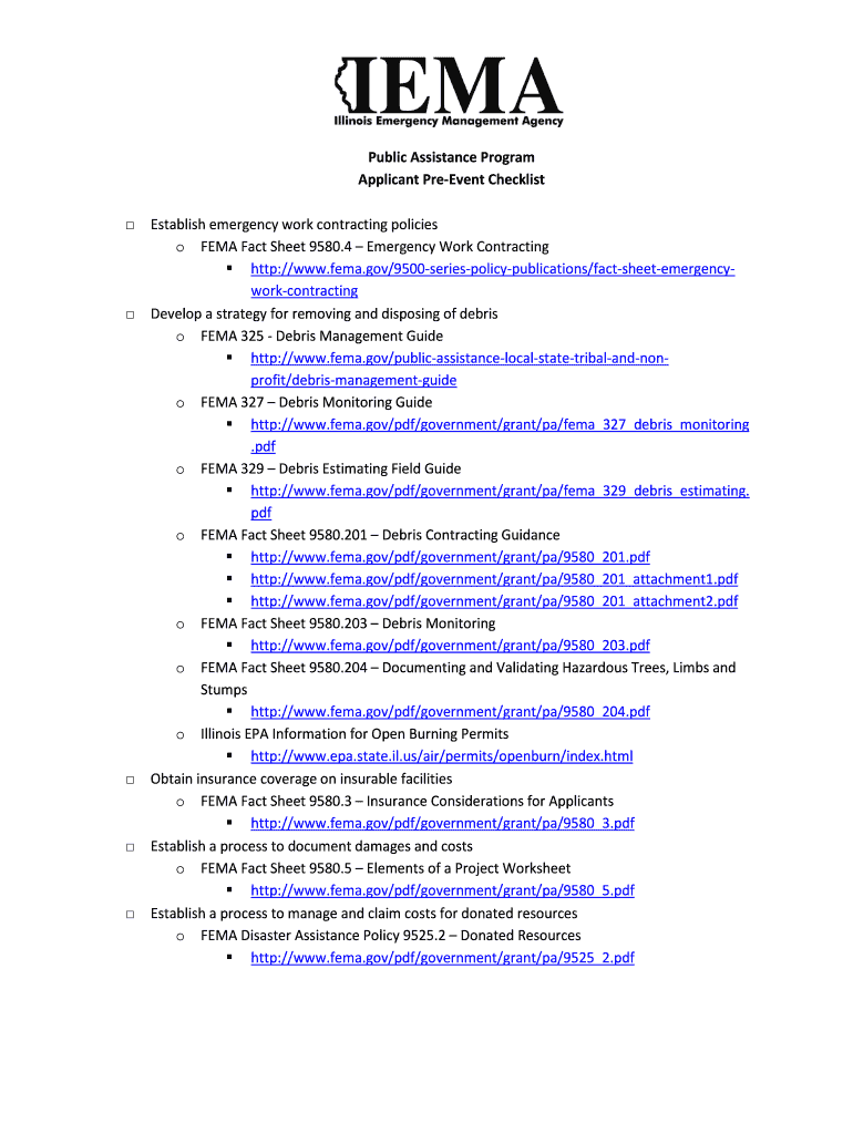 Public Assistance Program Applicant Prevent Checklist Establish emergency work contracting policies o FEMA Fact Sheet 9580.4 Emergency Work Contracting http://www.fema.gov/9500seriespolicypublications/factsheetemergencyworkcontracting